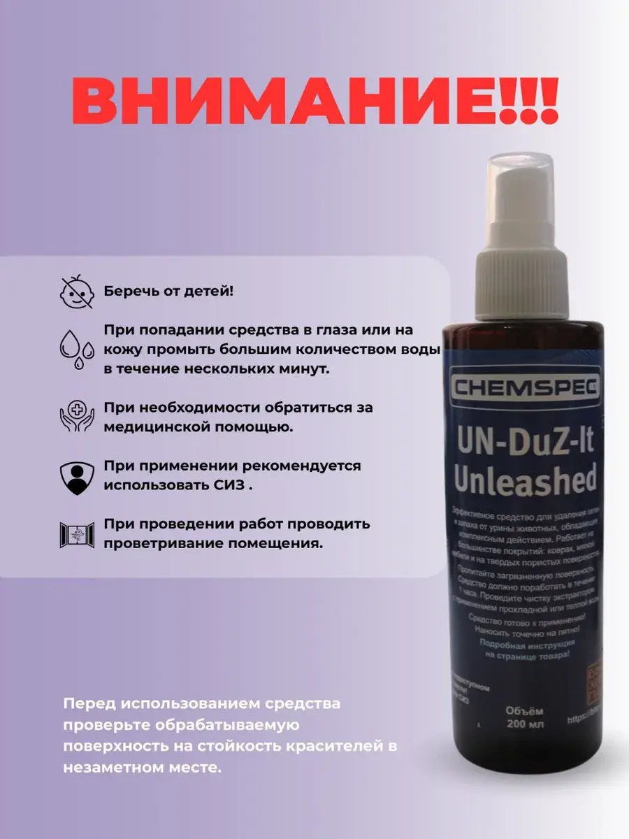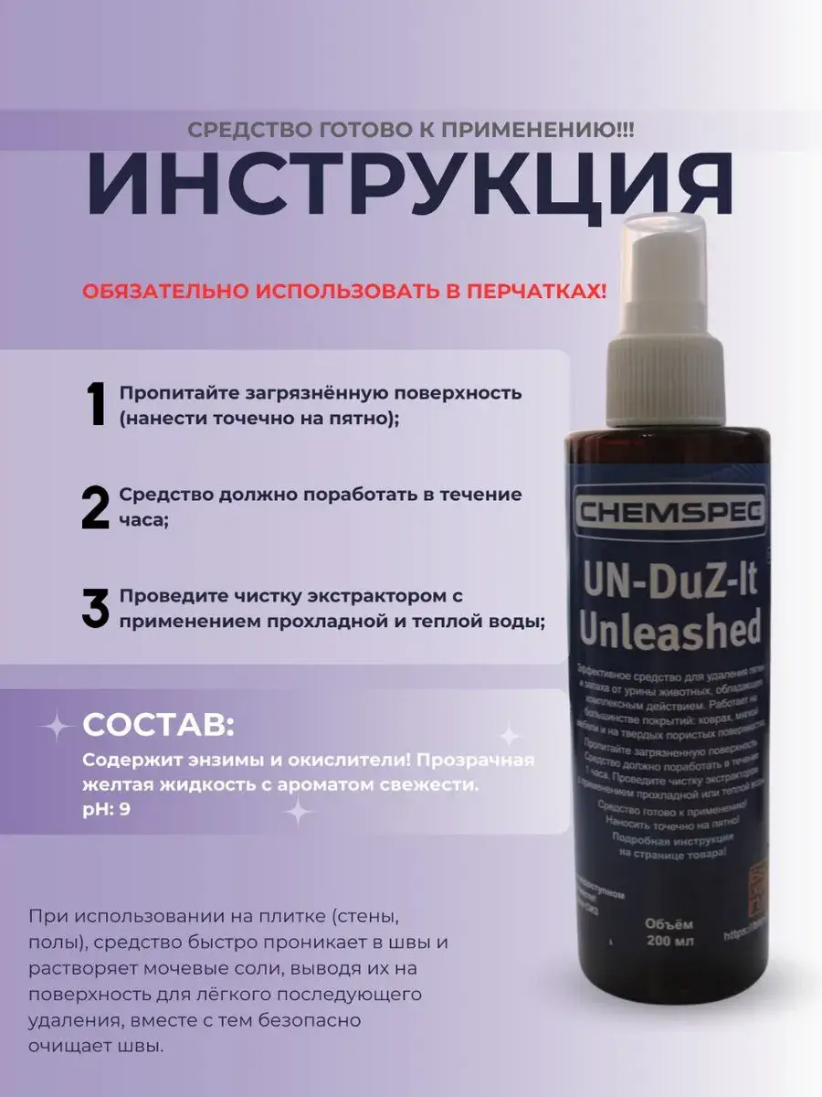 СредствоUN-DuZ-It Unleashed (Пробник 200 мл) обладает комплексным действием. Уникальное, прорывное решение сочетает в себе: окислители с энзимами и уничтожителями запахов, которые способны на устранения даже самого сильного запаха и пятен от урины домашних животных. Эффективно на большинстве покрытий: коврах, мягкой мебели и на твердых пористых поверхностях.