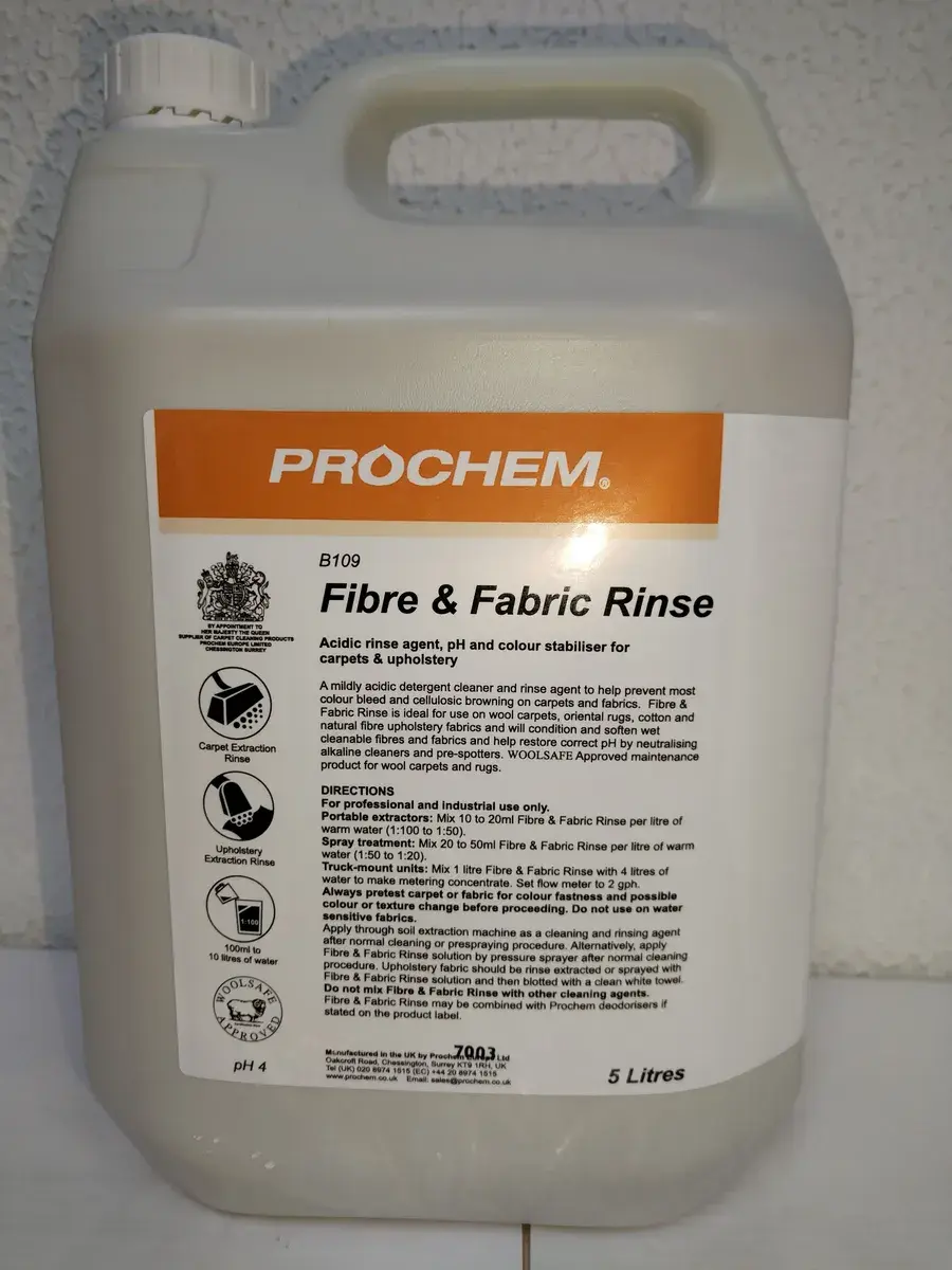 Fibre & Fabric Rinse – Слабокислотное моющее средство и ополаскиватель, который наносится распылителем или моющим пылесосом, предотвращает выцветание и появление желтизны от целлюлозной основы на коврах и мебельных тканях.